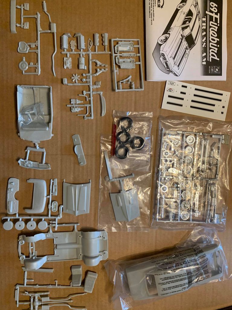 1 set of tires and 2 sets of rims; 400ci, V8 (6cyl opt); hoods for the Firebird 400 AND Trans Am; smaller decal sheet w/ T/A stripes. Good: One of the few model kits with a 6-cyl engine and single exhaust included. Bad: Engine is small for bay; hood fit is lousy; terrible overall quality; getting expensive; who wants a 6-cyl & single exhaust in a Firebird!?!?.