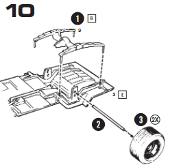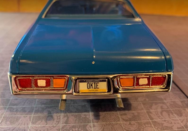 I didn’t take a pic of the underside, but needless to say it is a bit on the boring side. Like a lot of AMT/MPC kits, there is a post-with-holes axle – with raised and regular holes – and the axle itself is a one-piece. Low number of pieces and mediocre detail is the story. Adding insult to injury is a molded, single exhaust with catalytic converter. This bottom piece, or at least the design, is used with many mid-seventies MPC mopar kits and for those who’ll have nothing but dual pipes, it is a drag. I added a second full line on the driver side and tips out the back. It came out rather good, but was annoying to have to do so. Bummer.