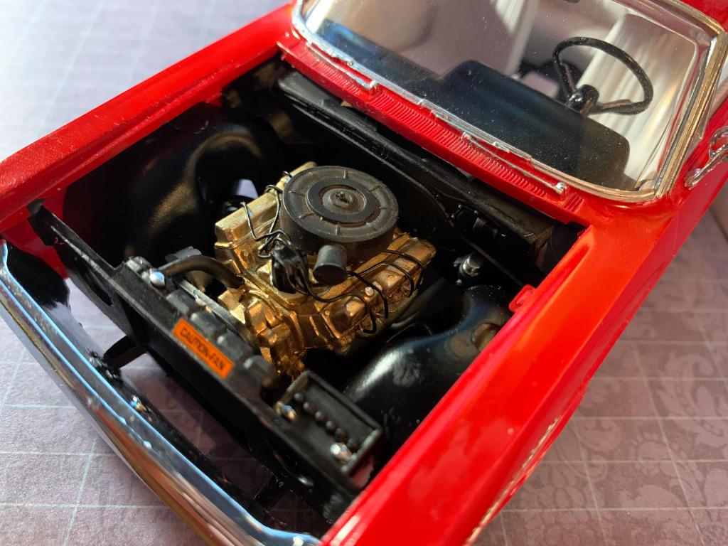 This interior is also VERY good for an AMT. The details are very well seen, and there is a lot to do. The ’65 dash is strewn with bright-work and the console is a nice touch. I had adapted the one I made for my car to have the column shift and a bench seat, but I kept the 4-speed and console for this one. The 427s with this setup were amazing, but the 390 would have been hot with it too.