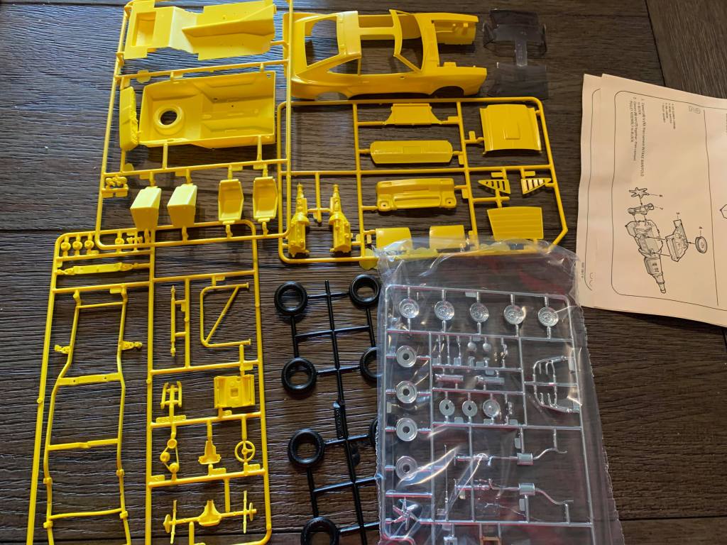 2 sets of tires and one set of rim; V8 engine; reasonable chrome tree; stripe kit (not pictured) to match the box.