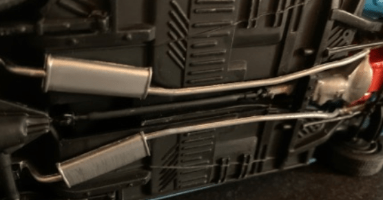 From good to bad again, the underside is terrible. The exhaust is molded and doesn’t allow for exhaust tips past the bumper. I fitted some down-facing tips that look ok from the back, but it’d be nice to have them be more correct. There is hardly any other detail under here and it really could use some. It was kinda helpful as rigorous as the other detailing was, however, I wouldn’t bother with display glass.
