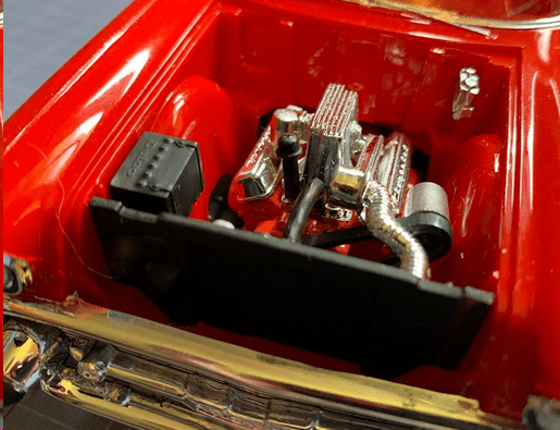 You are looking at one of my favorite engine bays. There is enough detail for anyone here and there is room for anything else you can imagine. Nicely detailed battery; wiper reservoir; wiper motor; detailed radiator; and master cylinder. The “340” decal is rubbish and doesn’t include the center piece. I made the one pictured and it was much better than the original. I also “wired” the engine – black – but you could even forgo it since the distributor in the back of the motor.