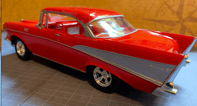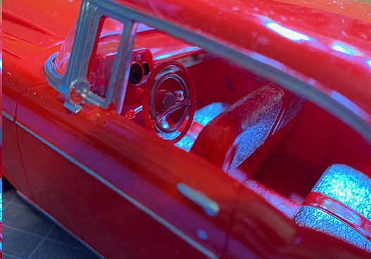 With this one molded in red, I decided to not bother going to one of the other half-dozen ’57 colors and chose Tamiya Pure Red to match the ’57’s Matador Red. I have to say there is a dump truck load of trim to do and it had me cross-eyed by the end. I used the 5-spoke rims vs. the originals as this kit did not come with whitewalls and I didn’t have any in my parts bin. The “street” setup is ridiculous as well. There is an insane hood scoop and… that is IT. No slicks, race gauges, crate motor, headers.. NOTHING. Using the scoop would be like putting a spiked collar on a Pomeranian. The biggest gripe I have on the outside is that the bumper was too wide. There is a small gap between the bumper and the quarter panel and after painting, I cannot fix it.