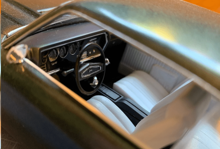 Like most Revell Mopars, the interior is well detailed. I went with straight flat black and pistol shifter. I forget if I had to add a directional stalk.. I don’t think so. Rear view and side mirrors are included, however. It is also 100% better than the AMT Charger’s interior… dreadful.