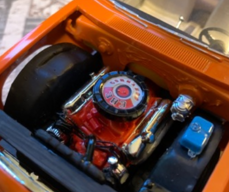 You are looking at one of my favorite engine bays. There is enough detail for anyone here and there is room for anything else you can imagine. Nicely detailed battery; wiper reservoir; wiper motor; detailed radiator; and master cylinder. The “340” decal is rubbish and doesn’t include the center piece. I made the one pictured and it was much better than the original. I also “wired” the engine – black – but you could even forgo it since the distributor in the back of the motor.