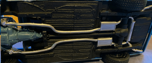 The bottom of this kit is typical AMT garbage. Low detail, poor fitting exhaust, molded shocks and little other detail. It also uses pins and a rod through the axles for movement, so the rear axle is molded as well. POOP. This car does come with exhaust tips that are top-5 best in the modeling kingdom.