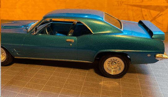 For paint I had to steel from the Mopar collection and use Sublime Green. They made Big Bad Blue for model cars, but not green. I sure wasn’t going to buy the real thing either.. I spend too much as it is and I was not buying a $20 spray bomb to do this car. Anyways, the color is very close and looks great on the AMC. I also stole proper magnum wheels from another kit and the tires to match. Besides that, I had to produce a rear view mirror, and a side mirror as well.