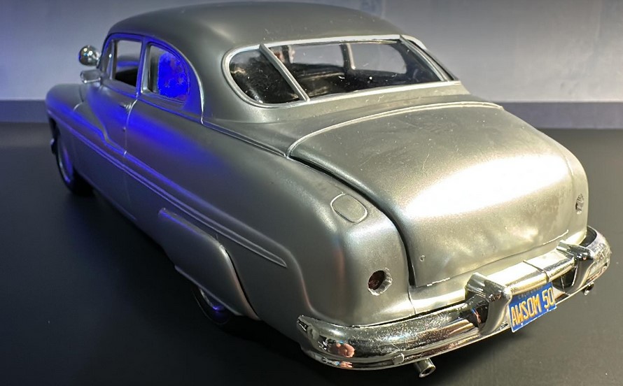 The interior was really nice, and I chose to leave it more or less stock save for the hurst shifter. The side mirrors are from mid-70s Plymouths available in over a dozen kits. They match the movie’s look well, but not standard Merc by any means.