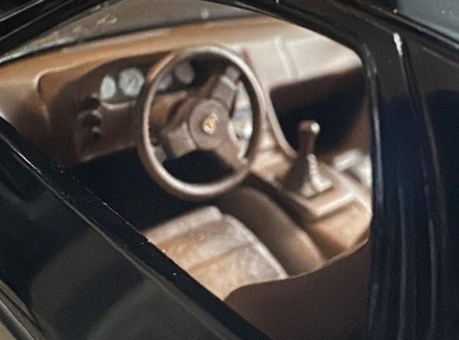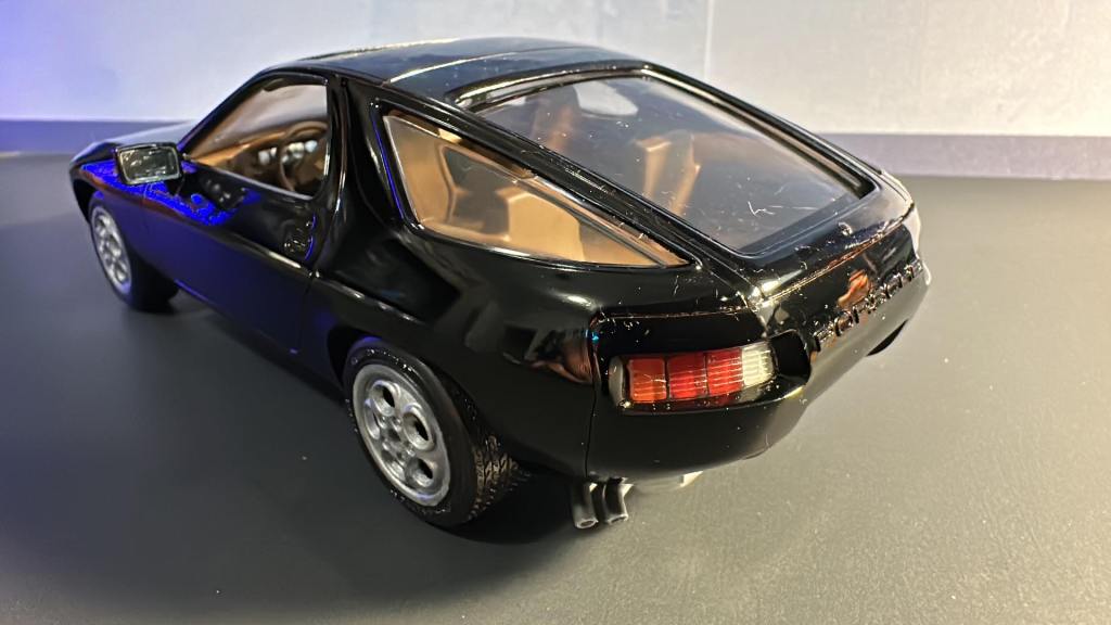 Painted Tamiya gloss black, there is little off from the “S” in the movie except for the rear wing and rims. There’s no Porsche model with the correct ones, and the wing isn’t included with the kit. No big deal, as the car has a nice presence itself. This car also doesn’t have the side markers, and they are shown on the box top. No, not a decal, just not on the car. Some 928s didn’t come with them, but the box shows em. Oh well.