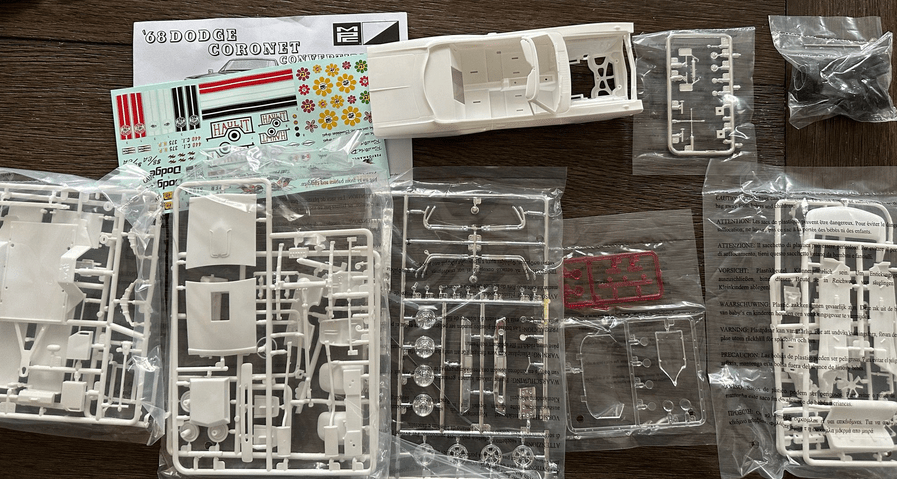 1 set of tires and multiple sets of rims; 340ci engine; TINY chrome tree, BIG decal sheet.